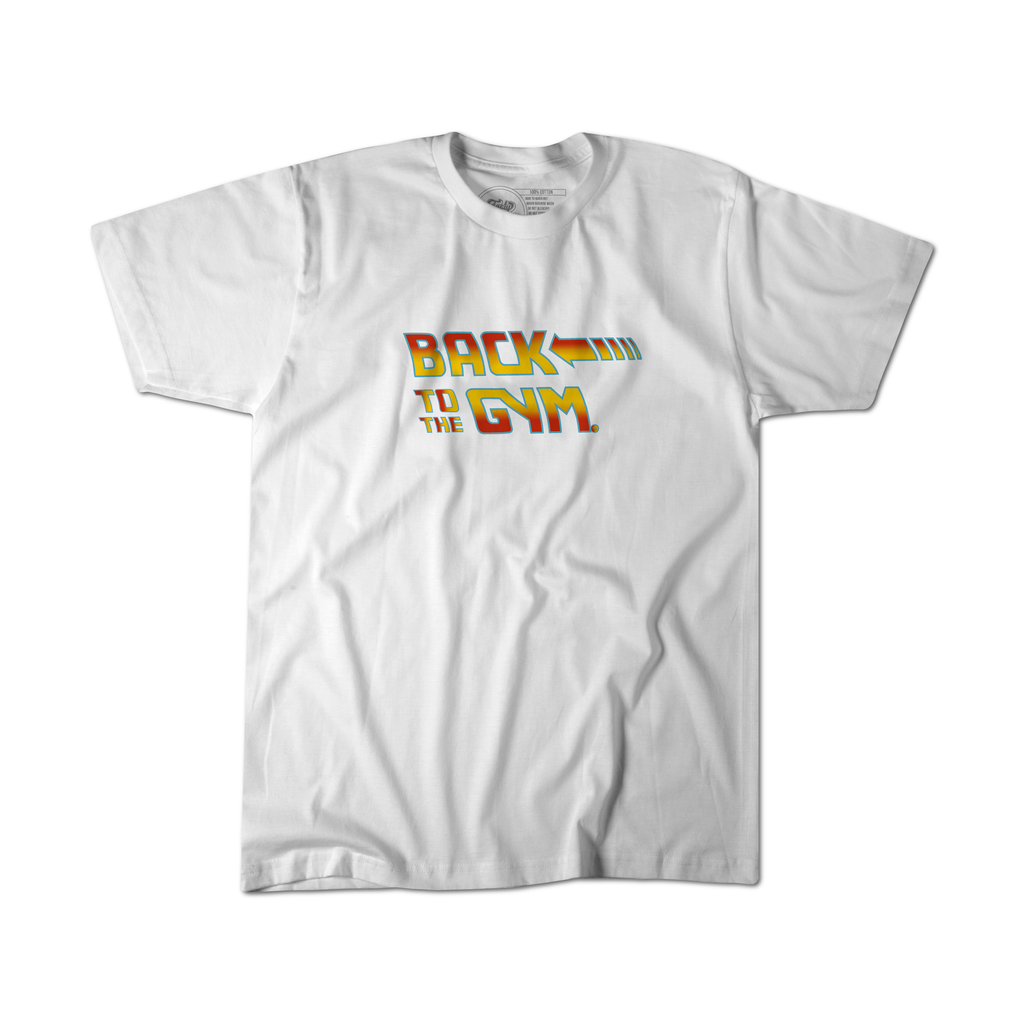"Back To The Gym" logo tee on a premium soft cotton, semi-fitted white T-shirt.